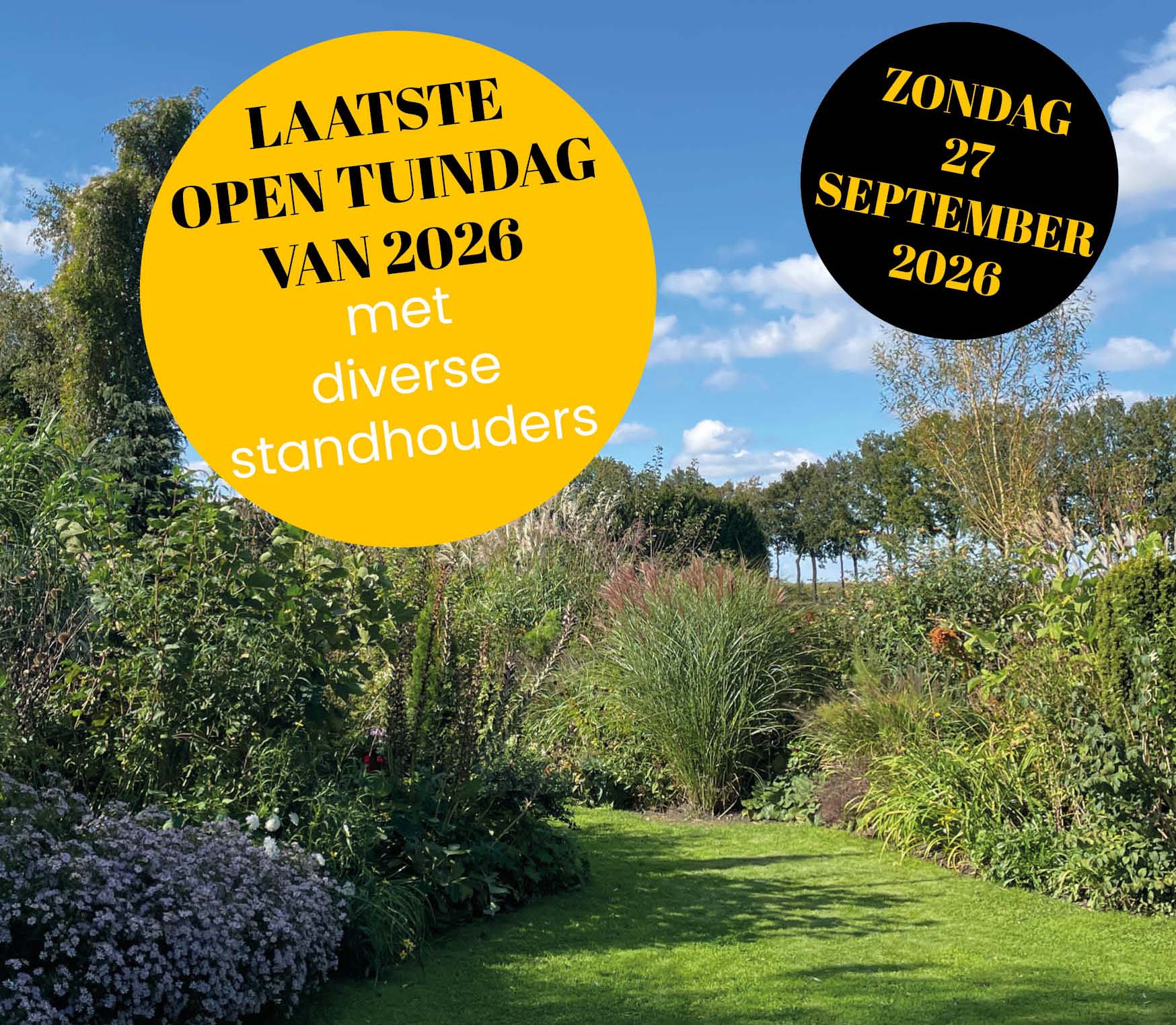 Kom op zondag 27 september 2026 tussen 10.00 en 16.00 uur genieten van een sfeervolle Open Tuindag! Laat je verrassen door een prachtige tuin in volle nazomerse glorie en maak kennis met bijzondere standhouders uit de regio.